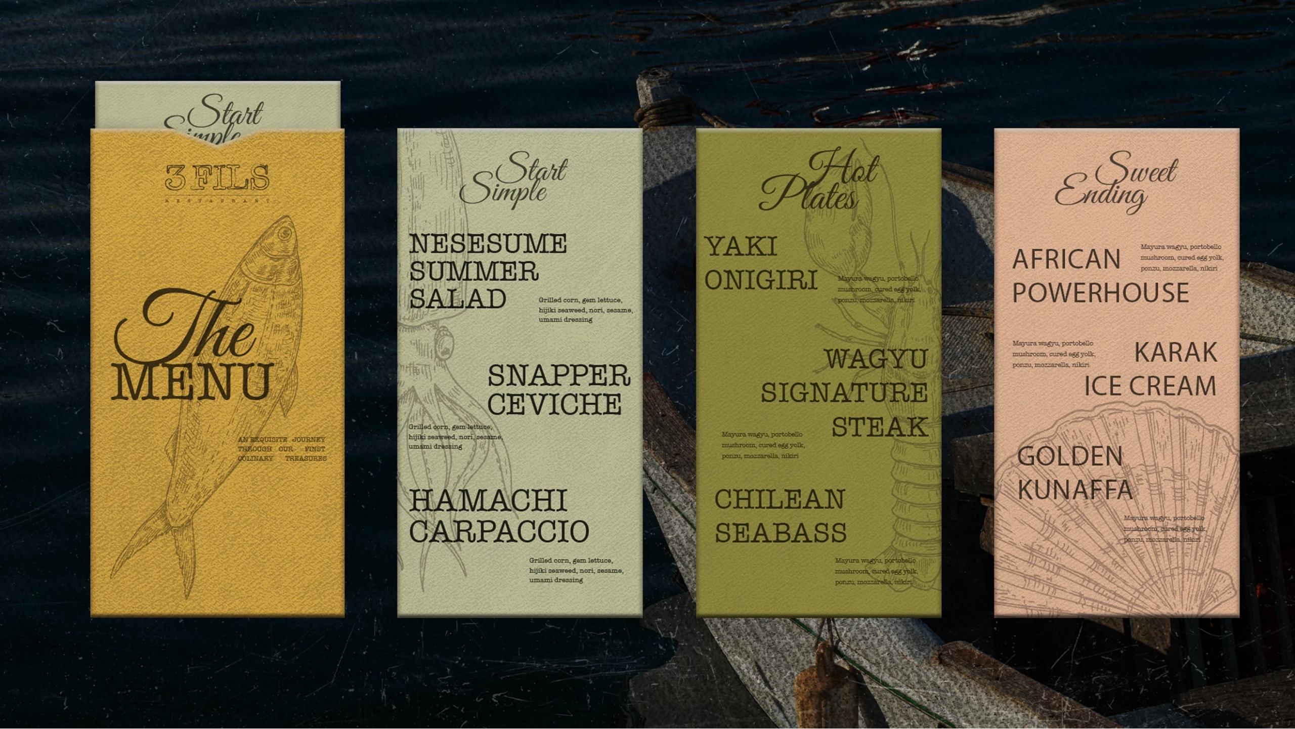 - Built a color palette inspired by sea and wood – deep, warm tones that reflect both the ocean and the restaurant’s cozy interior.